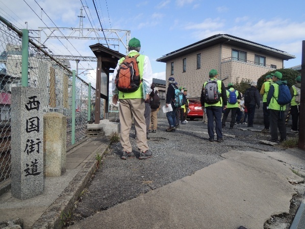 踏切を渡った所で、地図を使って西国街道の立ち位置や関連の旧街道の説明、石橋の由来など盛りだくさんな説明を受けます。